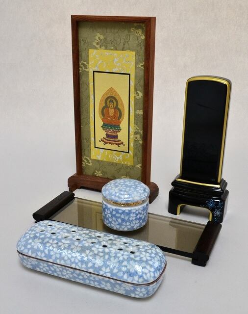 手元供養のお道具とご本尊様、お位牌をコーディネートした5点セットです。